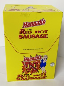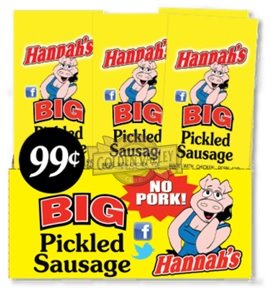 HANNAHS BIG PICKLED SAUSAGE ALL BEEF & CHICKEN P.P.$.99 20CT. BOX.
