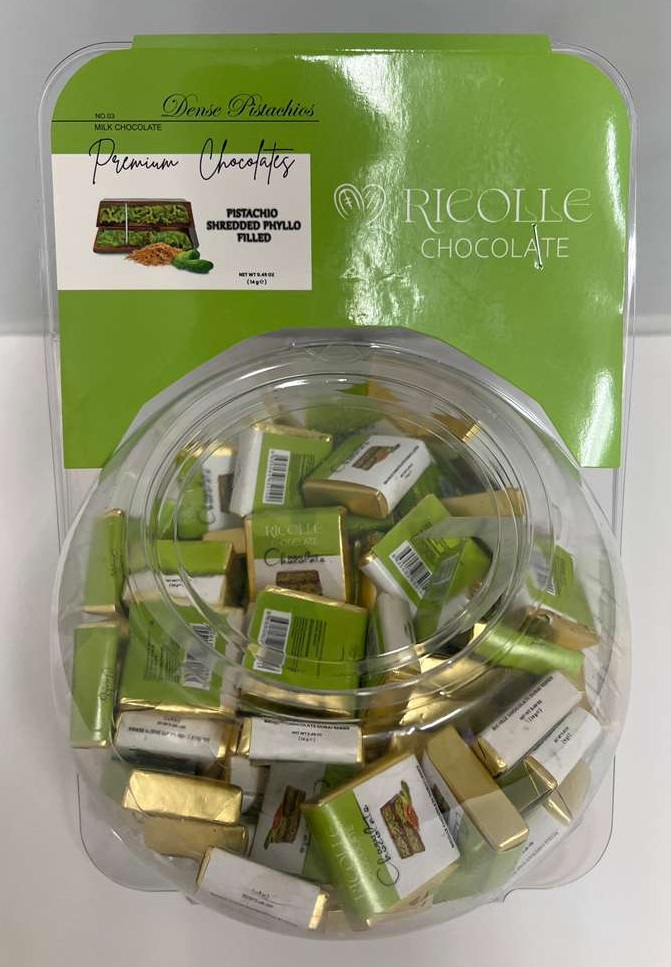 RICOLLE DUBAI CHOCOLATE PISTACHIO SHREDDED PHYLLO FILLED JAR.